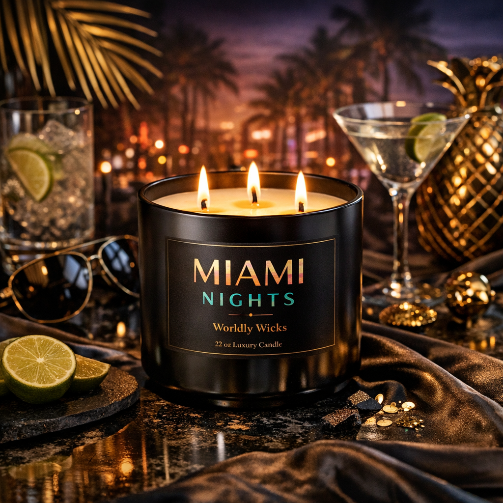 The Miami Nights Candle is a signature scent from the Worldly Wicks Collection β designed to capture the feeling of warm ocean air, vibrant nightlife, and the unmistakable luxury of a night in Miami. This is more than a candle β itβs an experience that transforms your space into a destination.